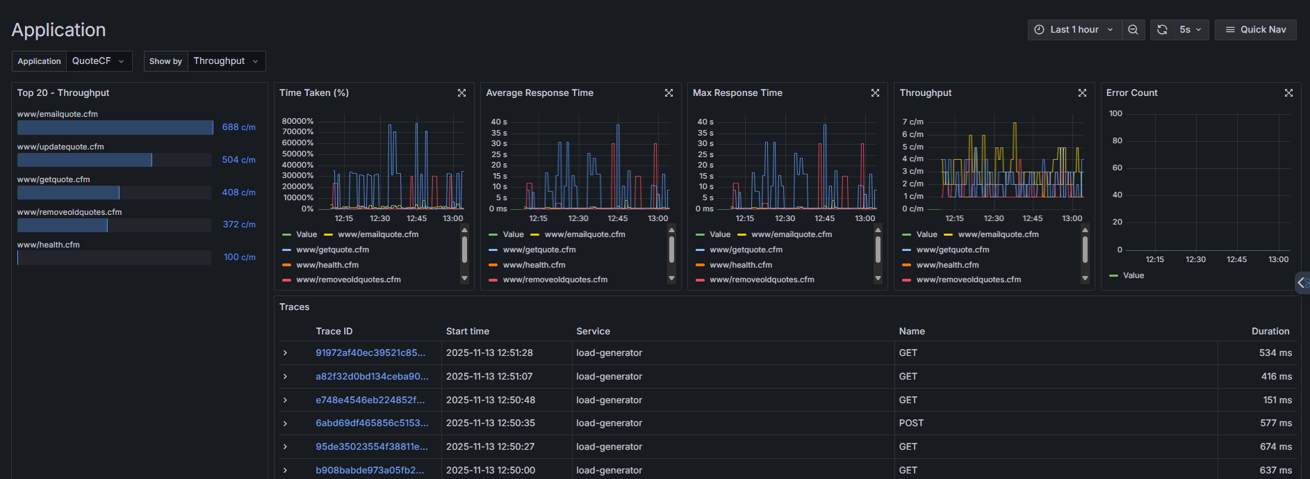 | Application Dropdown | Filters the data by application. Select which monitored application (e.g., QuoteCF) to analyze. |