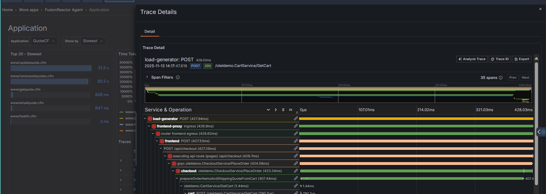 When you click on an application from the Applications Overview, you are taken to the Application Details view. This page provides detailed performance and transaction metrics for the selected application and helps you analyze the performance of individual endpoints or pages within the selected application (e.g., QuoteCF).