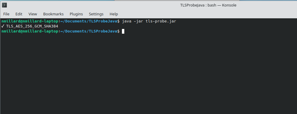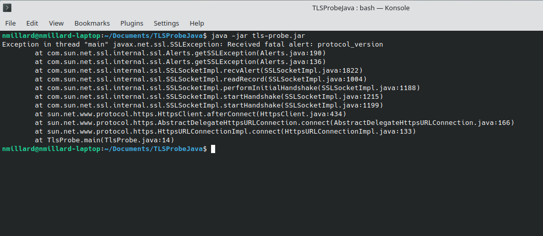 If the connection cannot be established (e.g. unsupported TLS version, network restrictions, configuration issues), the probe will display a Java error trace instead of a cipher suite.